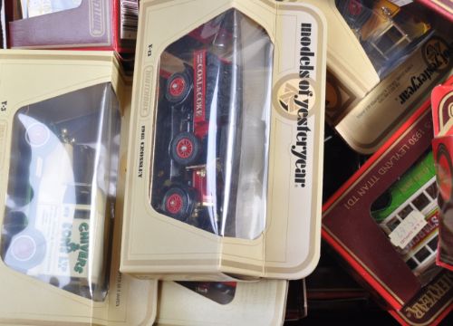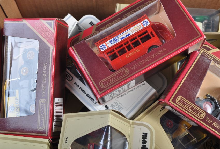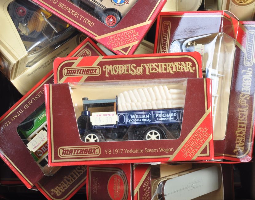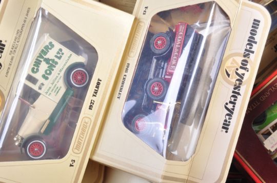 A large collection of approximately x54 assorted Matchbox Models Of Yesteryear / Y-series boxed diecast model cars and other vehicles comprising Y-3 Ford T, Y-22 Ford A, Y-23 Mack AC, Y-25 Renault AG and others. Largely advertising related; BP, OXO, Texaco, Dunlop etc. All within good original boxes. Good collection.