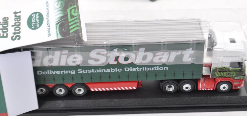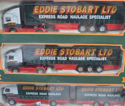 A collection of assorted Corgi and Atlas Editions boxed Eddie Stobart related diecast model trucks lorries. The collection comprising Motorway Truck Set with ERF and Scania Curtainside and Volvo Short Wheel base, CC13301 Dropside Lorry, x2 Lledo Days Gone examples and others. All contents appearing mint within original boxes.