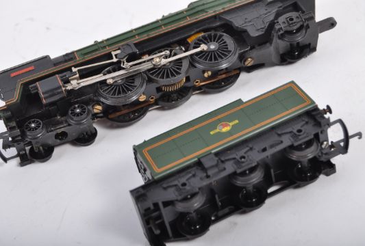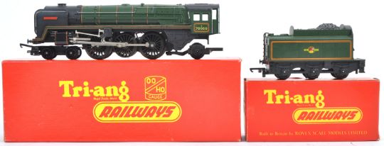An original vintage Triang made 00 gauge model railway trainset locomotive engine R.259 Britannia 4-6-2 green livery and matching R.35 tender. Models appear near mint, in good original boxes.