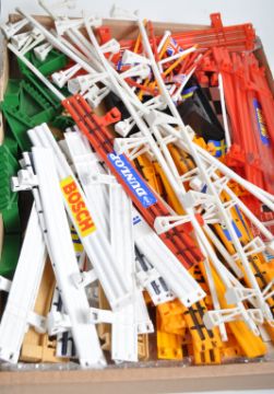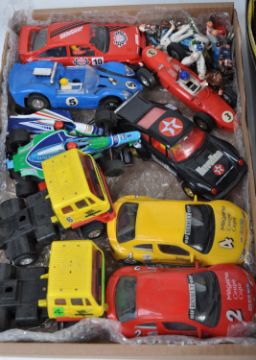A collection of assorted vintage Tri-ang / Triang and Hornby Scalextric slot car racing items comprising a boxed set No. 80 containing the x4 original cars, x2 controllers, a quantity of track and instruction sheets, a large selection of trackside pieces including flags, barriers and spectators and a collection of x10 assorted rally and Formula 1 cars. Cars to include Renault Megane, Porsche, Ferrari and others. Good assortment.