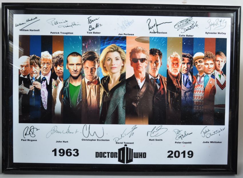 A collection of x6 assorted Doctor Who related memorabilia / action figure toys to include a x2 ' Character Options ' made Tardis Phone Boxes, one being an alarm clock and the other a ' Spin and Fly Tardis ' along with x2 mini diecast sets comprising a Dalek and Cyberman set and Dalek Sec and Tardis, a Doctor Who boxed mug and a framed print with a selection of facsimile autographs. All contents appear mint and unused, housed within original boxes.