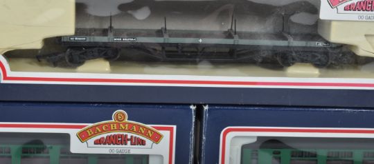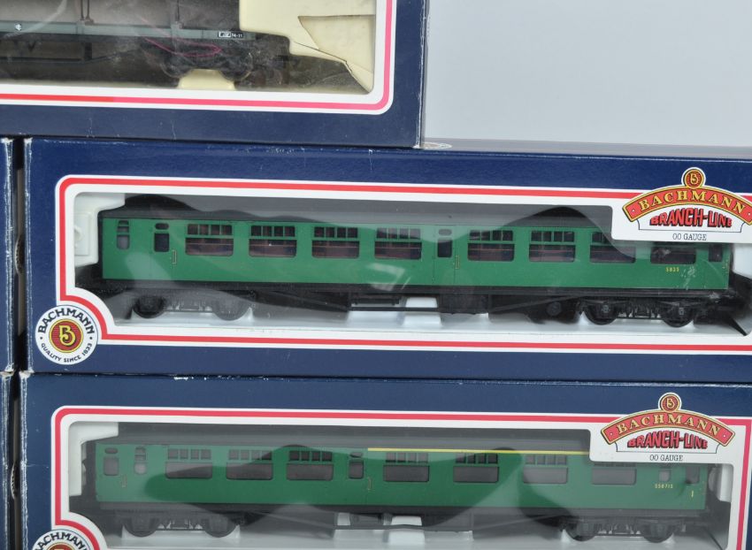 A collection of x9 assorted Bachmann made Branch Line 00 gauge model railway trainset locomotive coaches and carriages comprising x4 model No. 34-550 63' bulleid corridor composite malachite green, x3 model No. 34-525 63' bulleid corridor 2nd malachite green, 33-851 30 bogie bolster wagon and 33-901C 45 ton bogie well wagon. All models appearing mint within original boxes.