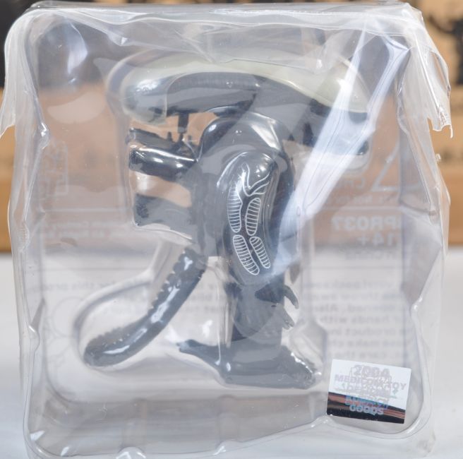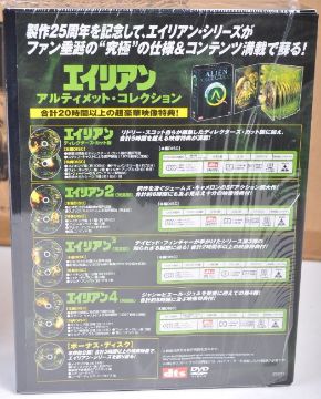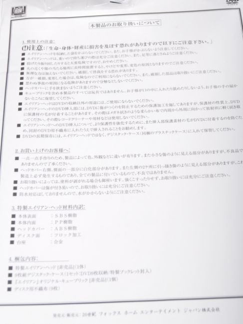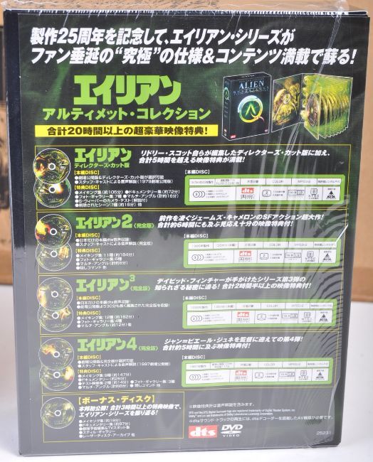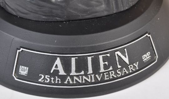 A Japanese import 25th Anniversary Edition Alien Quadrilogy DVD box set display case in the form of an Alien head. The top of the head to be removed revealing 9 slots for the included DVD box set. A highly detailed model housed within the original outer cardboard box