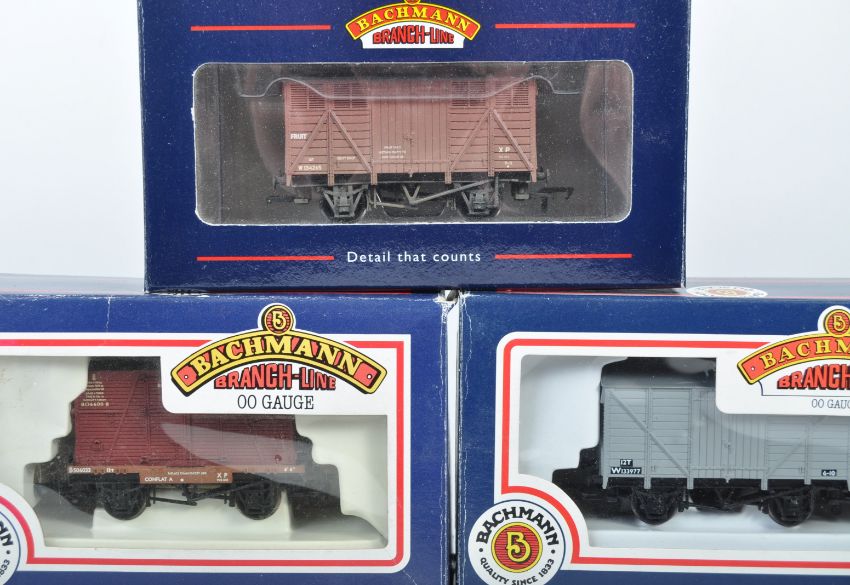 A collection of x10 assorted Bachmann made Branch Line 00 gauge model railway trainset locomotive rolling stock wagons comprising 33-601 12 Ton Ventilated Van grey, 33628 12 Ton Planked Van (weathered), 33-204 12 Ton Fruit Van, 37-251A 16 Ton Steel Mineral Wagon and others. All models appearing mint within original boxes.