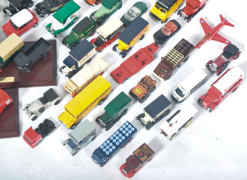 A large collection of assorted diecast model cars, buses and other vehicles of various scales and makers to include Bburgo and Maisto 1/8 Chevrolet and Aston Martin, x5 display mounted Lledo Days Gone sets (Classic Brewery Collection, London Bus Collection, Public Services Collection and more) EFE Exclusive First Editions, Corgi, Vanguards, Matchbox, Lledo and other. Some boxed and unboxed examples. Good assortment.