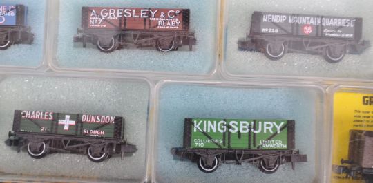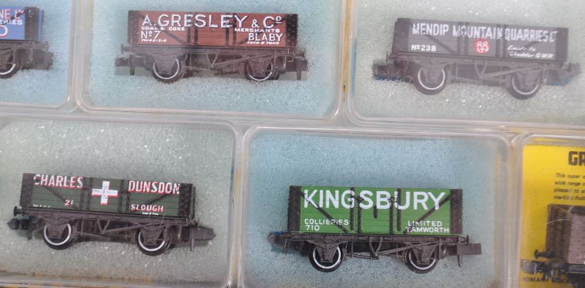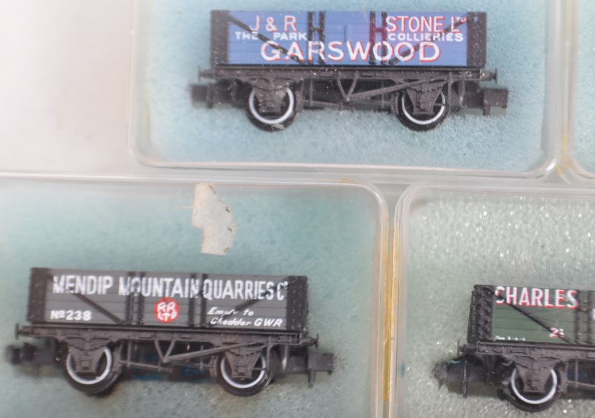 A collection of x20 assorted Graham Farish and Peco made N gauge model railway trainset rolling stock wagons comprising Twin Vent Van John West, Salt Wagon, Single Vent Van Worthington, LMS Brake Vans, Plank Wagons and others. Good assortment.