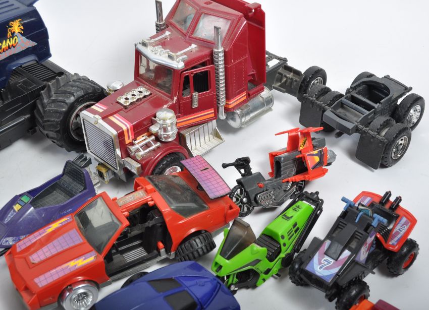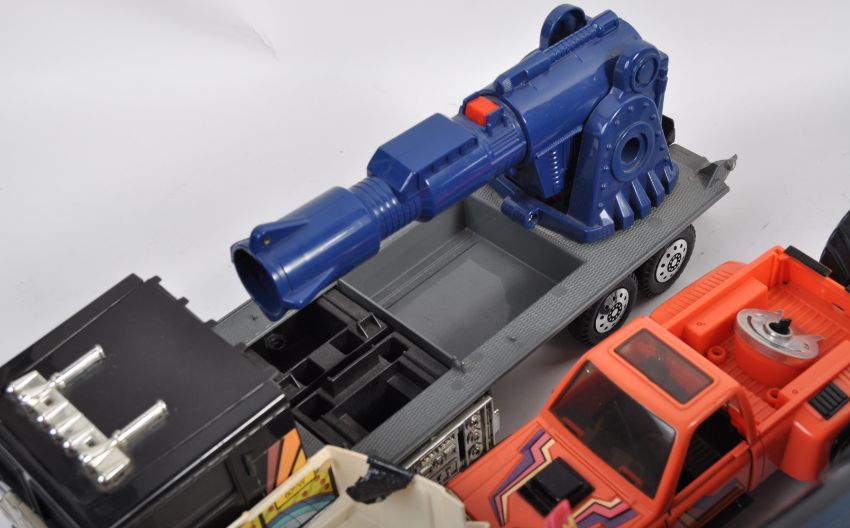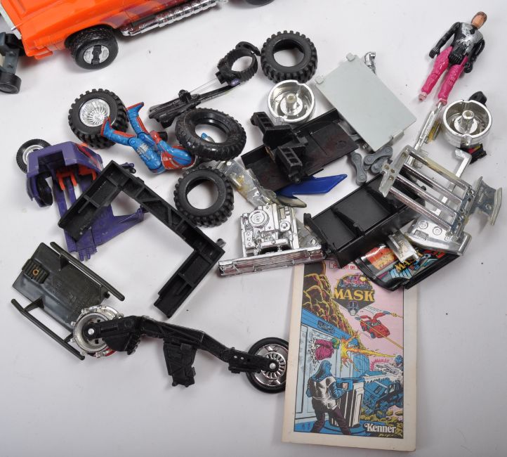 A large collection of original vintage 1980's retro Kenner made MASK action figure playsets vehicles to include; Slingshot (with inside jet and action figure), Firecracker, Gator, Raven, Thunderhawk, Volcano, Outlaw Snake Oil truck (with missile), Stinger and Rhino along with a small quantity of MASK action figures and accessory parts. Great vintage collection.