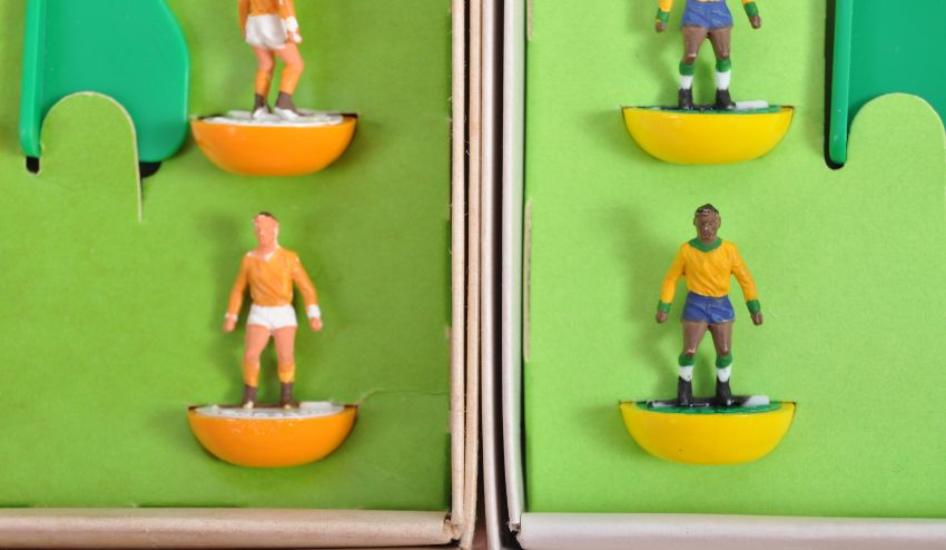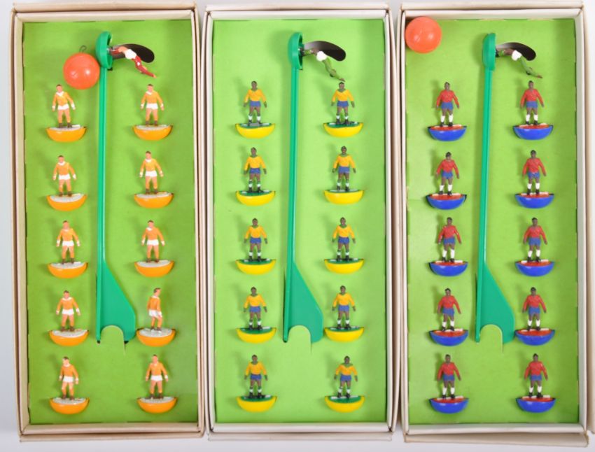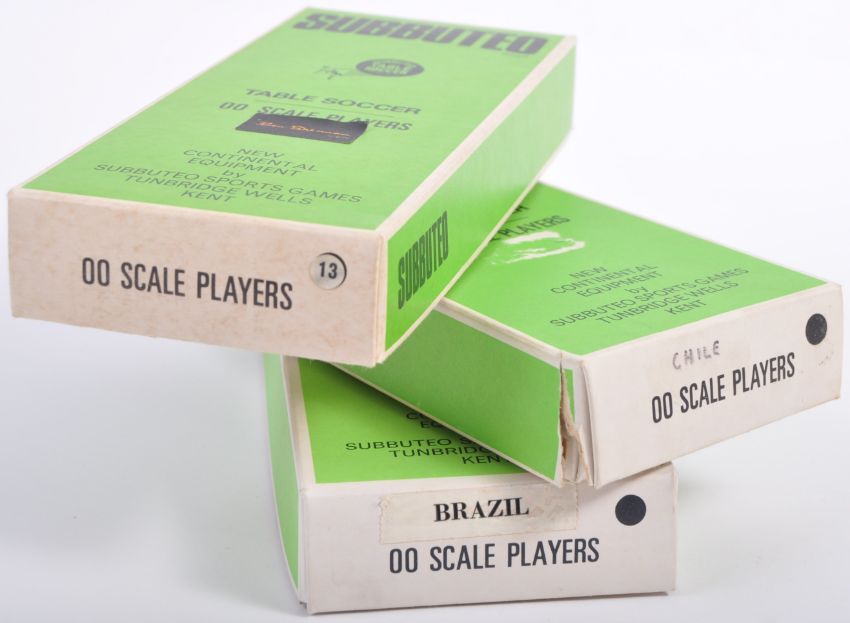 A collection of x3 original vintage early 1970's Subbuteo table top football / soccer boxed 00 scale players comprising Brazil, Chile and x1 other unknown team of white a yellow kit. Figures appearing near mint within good original boxes. From a genuine childhood collection
