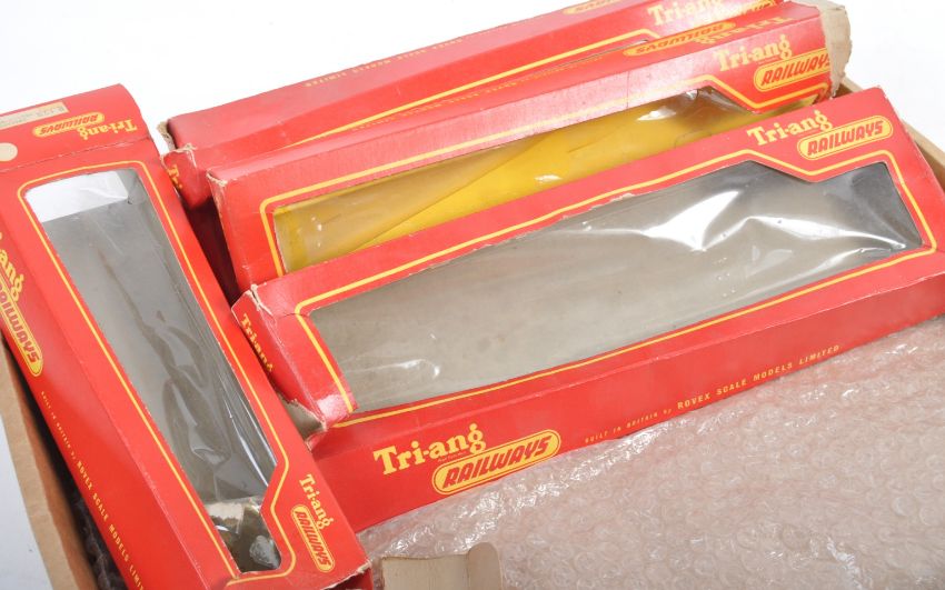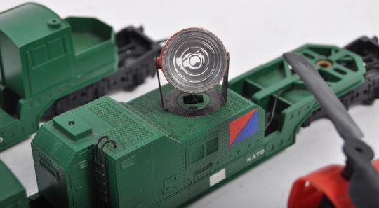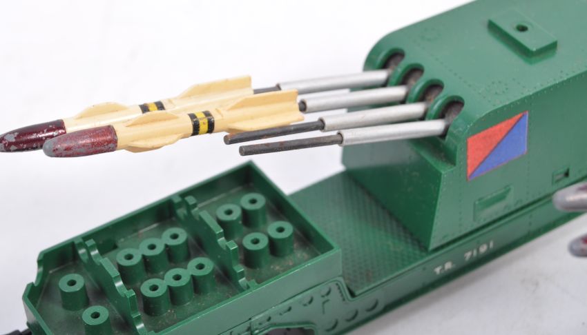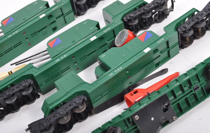 A collection of x4 original vintage Triang / Triang 00 gauge model railway trainset rolling stock Battle Space / NATO platforms comprising R341 Searchlight Wagon, R343 Rocket Launcher (x2) and R128 Helicopter car (missing window). Three original (tatty) boxes present.