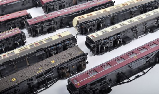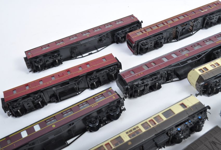 A collection of x10 Mainline and Airfix made 00 gauge model railway trainset locomotive carriages and coaches to include LMS brake and corridor coaches, passengers carriages, GWR Auto Coaches brown and cream and others. Good collection.