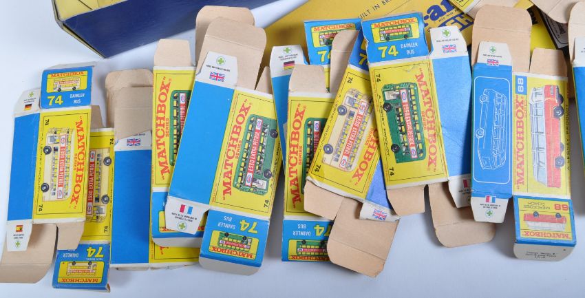 A large collection of assorted vintage diecast model cars and model railway trainset locomotive empty boxes comprising Dinky Toys, Corgi Toys, Matchbox Moko and Lesney, Spot-On, Triang 00 gauge and others. Boxes largely flat packed and appearing very good to very good+. Excellent assortment.