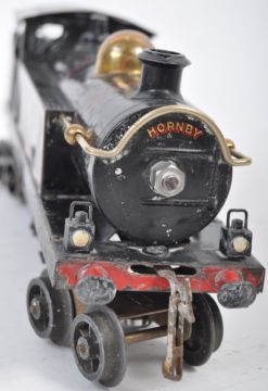 An original vintage Hornby 0 gauge tinplate clockwork model railway trainset locomotive engine LMS London Midland & Scotland Railway 4-4-4 black livery. Mechanism in working order. A charming vintage loco.