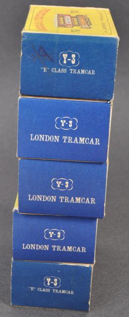Matchbox Models Of Yesteryear - a collection of x5 Lesney made Matchbox Models of Yesteryear. All Y-3 / Y3 E Class Tramcar models. Each a standard variation with red body and black base. All models appear very near mint to mint, in excellent to very near mint original boxes. Very likely unused stock.