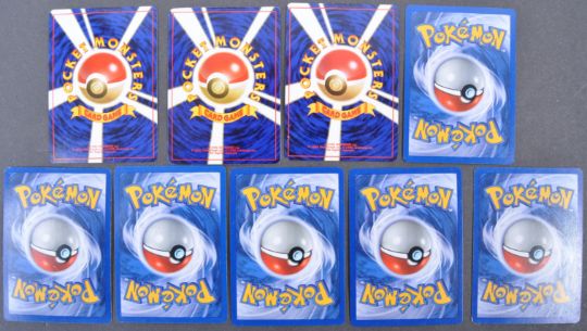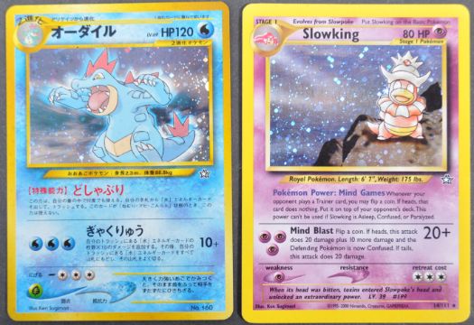 A collection of 9x original vintage 1990's / 2000's Wizards Of The Coast WOTC Pokemon The Trading Card Game Pokemon Cards from the original Neo Genesis & Neo Destiny sets - all holo shiny rare cards comprising 16/105 Miracle Energy (possible copy), 9/105 Dark Scizor, 13/105 Light Azumarill, 208 Japanese Steelix, 3/111 Bellossom, 8/111 Kingdra, 157 Typhlosion, 160 Feraligatr, & 14/111 Slowking.. All in various conditions. From a good childhood collection.