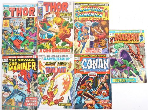 Comic Books - an assorted collection of vintage 1970s Marvel comics, comprising: The Mighty Thor #213, The Mighty Thor #166 (Second Appearance HIM / Warlock), Captain America And The Falcon #164, Daredevil #108, The Savage Sub-Mariner #69, The Human Torch and Iron Man #29, and Conan The Barbarian #23. Various conditions, but all generally fair to good and complete with covers.