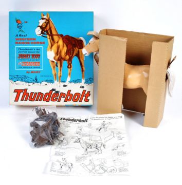 An original vintage Marx Toys made Johnny West series ' Thunderbolt ' action figure horse playset No. 2061 ' A Real Western Range Horse! '. Appears complete and likely unused, within its original box. Accessories present, the horse still retaining its inner card inserts. Within the original box.