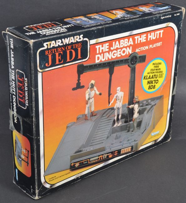 Star Wars - a rare original vintage 1980s (1983) Kenner made Star Wars Seers Exclusive 1983 action figure playset ' The Jabba The Hutt Dungeon '. Featuring x3 action figures Klaatu, Nikto and 8D8. The figures 100% complete, the playset 100% complete. Includes the original instructions sheet. Housed in its original Return Of The Jedi box (generally VG to VG+). Sought after playset.