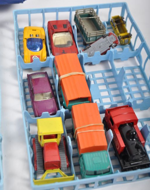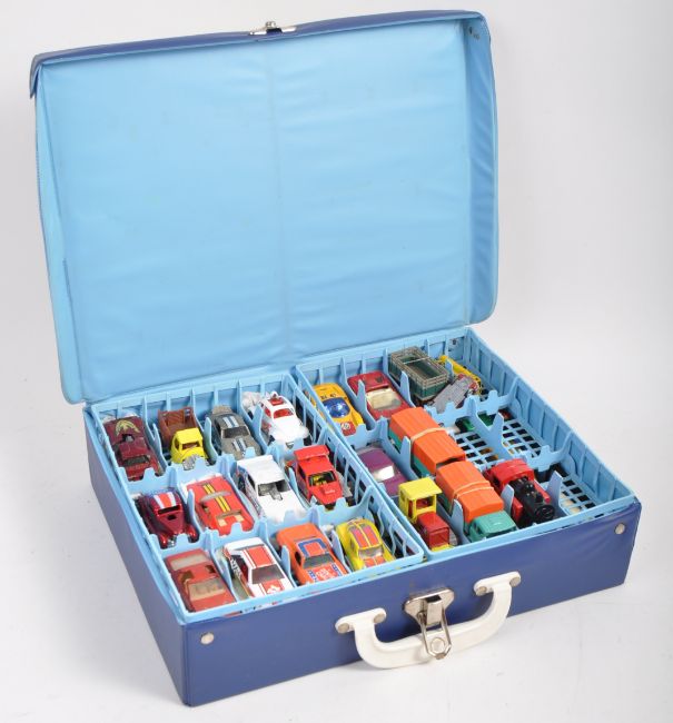 An original vintage vinyl Matchbox Series Collector's Case with an assortment of diecast vehicles by makers to include Hot Wheels, Corgi Rockets, Matchbox Lesney, Corgi Juniors, Siku, Corgi Whizz Wheels and others. The case retaining the original inner trays. Good collection.