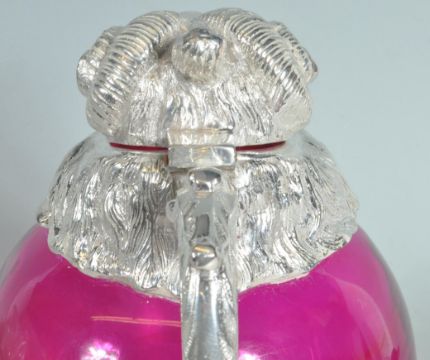 A silver plated decanter having a moulded rams head jug to the top with with lever mounted onto a bulbous cranberry glass base. Measures 19cm tall. Marked JD&S to the handle.