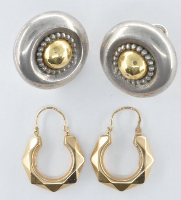 Two pair of stud earrings to include a pair of silver and 18ct gold round panel earrings with hammered gold centres (marked 925 and 750, measures 2.5cm diameter, weight 13.1g), and a pair of 9ct gold faceted hoop earrings (marked 375, weight 1.9g, measures 2.7cm).