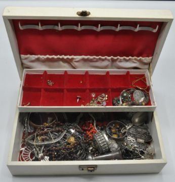 A collection of vintage 20th century costume jewellery comprising of necklaces, earrings, rings, bracelets, brooches and more. Comes with a jewellery box opening reveal a fully appointed interior.