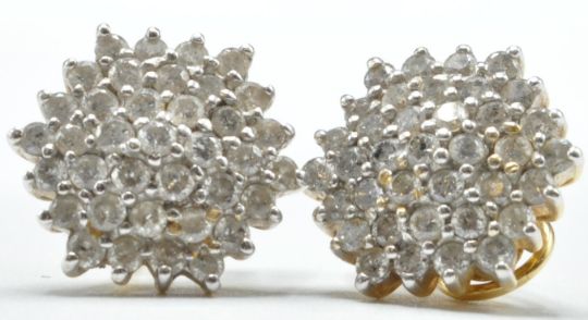 A pair of 18ct gold and diamond cluster earrings each set with 37 round cut diamonds in a hexagonal shape. Diamonds estimated at 2.2 cts in total. Hallmarked to the post Sheffield 1999. Weight 8.3g. One earring missing lever back.