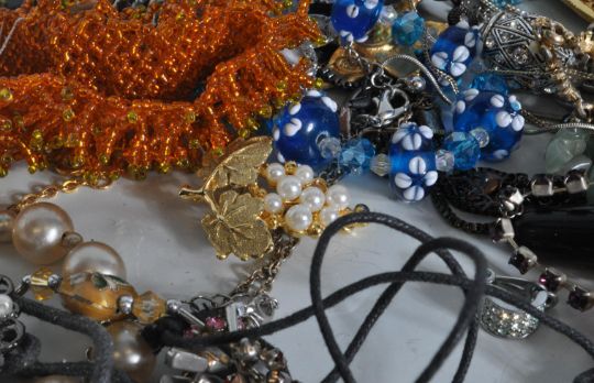 A large collection of vintage 20th century costume jewellery to include yellow metal necklaces with multicolour stones, a vast variety of yellow metal brooches with clear stones and enamel brooches, blue beaded ring, scrolled bangles, white metal bracelets with butterfly decoration, pendant necklace, watches, and many more.