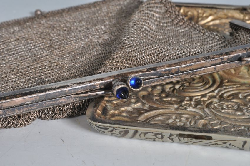 A hallmarked sterling silver cigarette case having a central cartouche surrounded by floral decoration. Date mark reads V. Other hallmarks illegible. Gross weight 88g. Together with a white metal evening purse having a blue stone finials to the clasp.