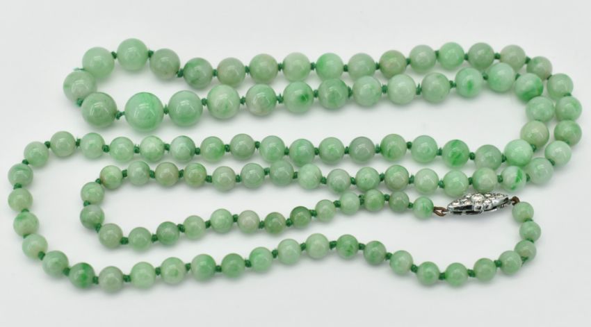 A Chinese Jade bead necklace and earrings suite. The necklace strung with graduated jade beads united by paste set clasp with matching silver strung bead drop earrings. Total weight  / measures necklace 80cm long - earrings 2.5 cm drop