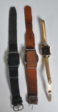 Three vintage early 20th century watches to include a black faced services watch with unusual star and crescent markings, luminous dauphine hands and red seconds hand. Together with a vintage Art Deco tank faced Siro watch with swiss jewelled movement and a rolled gold 1930's Technos ladies cocktail dress watch with 21 jewel movement