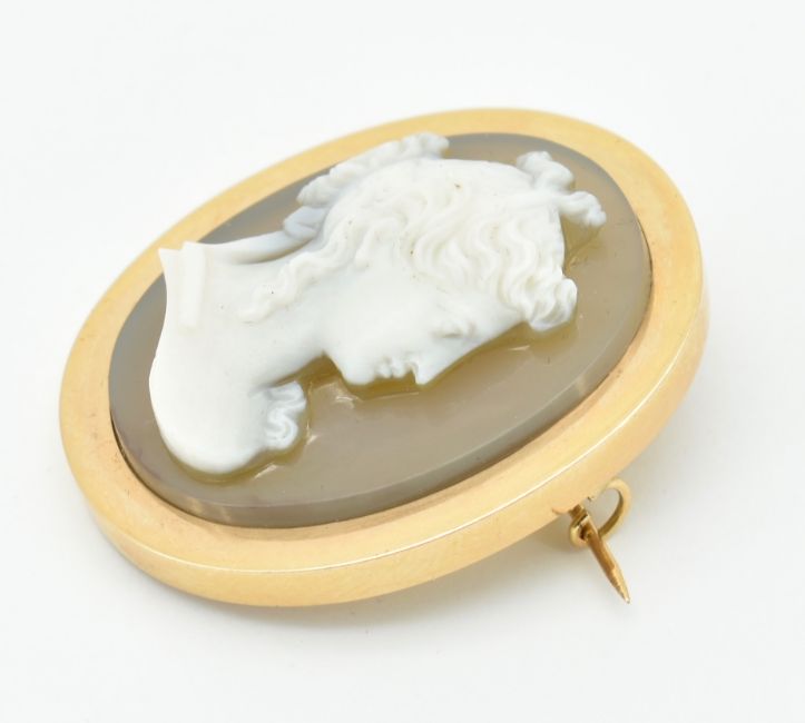 An 18ct gold and agate carved cameo brooch & pendant pin. The cameo set within an oval bezel setting with carved agate cameo of a lady having c-clasp pin and bale pendant verso. Total weight 16.7g / Measures 4cm x 3cm