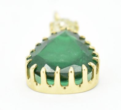 An 18ct gold, emerald and diamond drop pendant. The pendant strung with a claw mounted pear cut emerald surmounted by a cushion old cut diamond.  The emerald measures  approx 11mm x 13mm x  14.7m, estimated diamond weight approx 5mm x 4.5mm x 3.4mm. Total weight 1.8g / measures approx 2.5cm inc bale