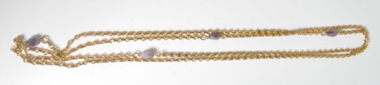 A yellow metal and amethyst coloured glass guard chain - necklace. The long chain with bar spacers having 3 amethyst coloured glass stones. Length 136cm