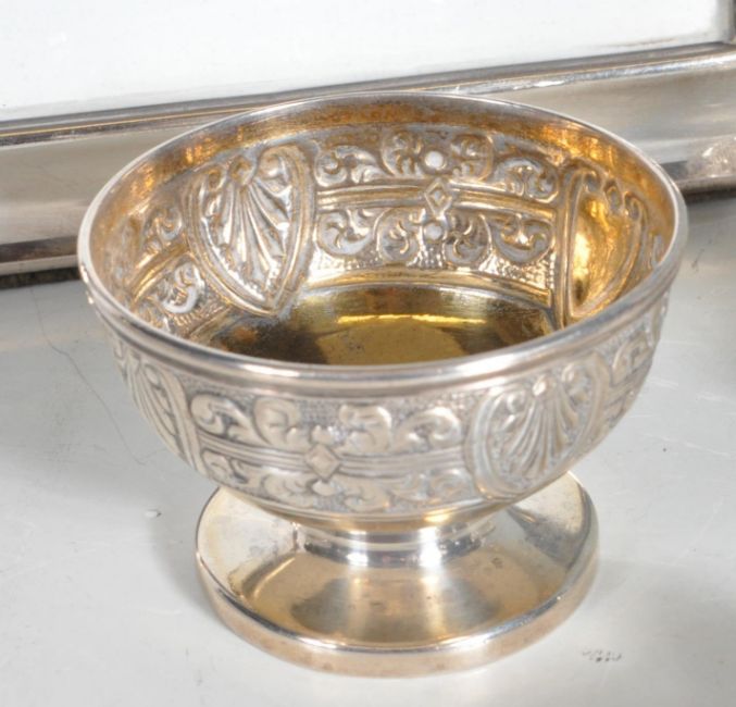 A collection of antique and later hallmarked sterling silver items comprising of an antique silver vanity mirror,  silver bowl, silver photo frame, silver topped cloisonne scent bottle, a silver pill box & a glass trinket pot with silver collar. Photo frame measures 22cm x 17cm. Gross weight 863g.