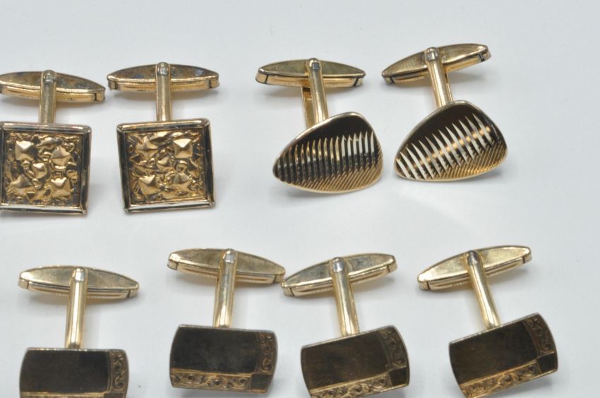 A collection of gentleman's gold on silver cufflinks of various styles of shapes, some having unengraved initial panels, bark effect panels etc. Also include some gold on silver tie clips. All marked gold on silver. Weight 78.1g.