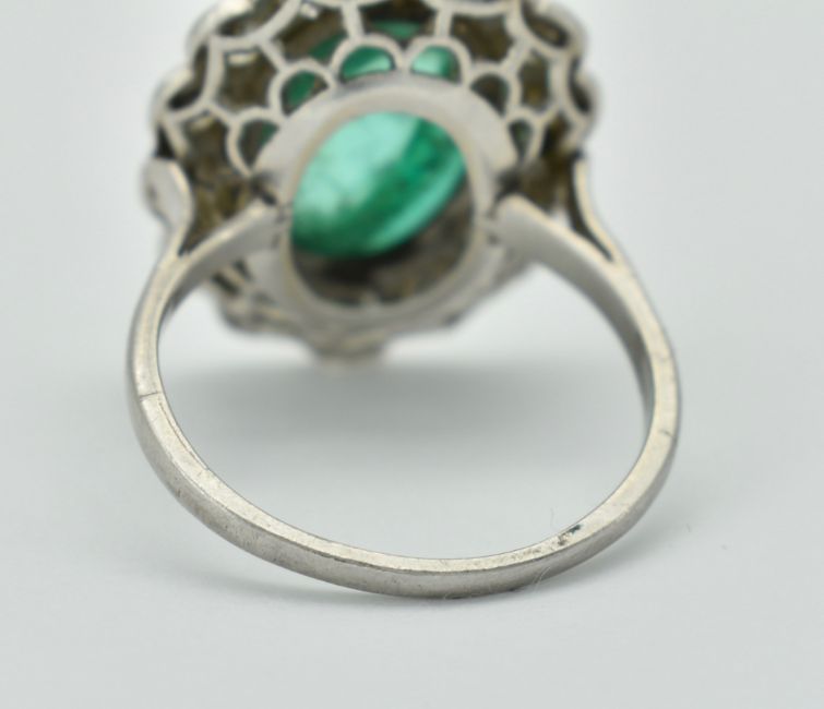 A platinum, emerald and diamond cluster ring. The ring set with an emerald oval cabochon within a halo of round brilliant cut diamonds. Emerald measures 12.5mm x 9.5mm x 5.3mm. Estimated total diamond weight 1.4ct. French Mascaron marks to shank. Total weight 7.28g / Size P.5
