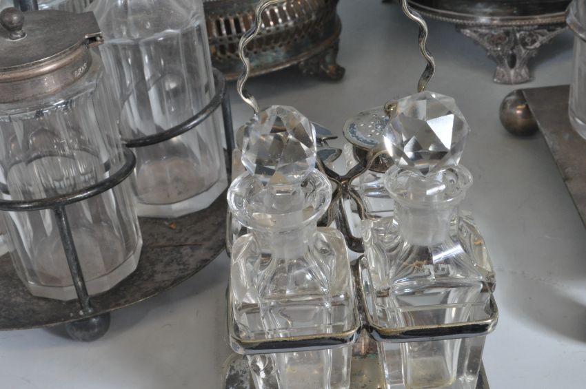 A collection of five late 19th century and 20th century antique silver plated and cut glass cruet sets. The collection comprising of various types of silver plated stand by various silver smith makers with cut glass condiments pots and stoppers.