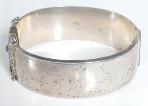An early 20th century continental hallmarked sterling silver bracelet bangle having yellow metal floral embellishments with safety chain to the clasp. Measures 50g
