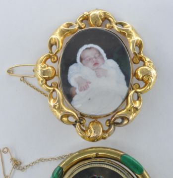 Two 19th Century Victorian swivel photograph brooches to include one of oval form set with four green malachite panels, the other with scrolled borders with engraved decoration, both having pins to the verso. Measures approx 6.5cm and 6.1cm.