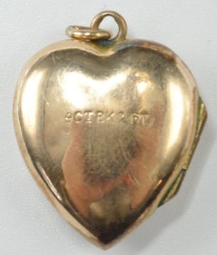 A group of gold plated items to include a gold plated seal fob set with a red stone panel engraved with initials, an edwardian photo pendant having applied foliated with turquoise and pearl, and a 9ct gold front and back heart shaped locket. Pendant measures 3.2cm.