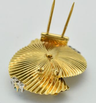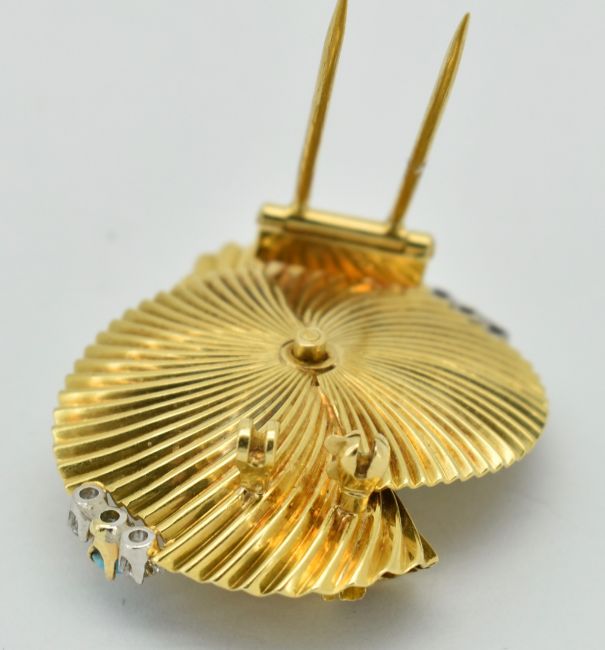 An 18ct gold, turquoise and diamond Cartier brooch clip. The brooch in the form of a coiled and fluted fans set with turquoise cabochons and round brilliant cut diamonds having twin pin verso with roller clasp. Signed Cartier 3135 18K. Total weight 19.5g / Measures 4cms