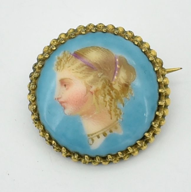 A 19th century continental enamel portrait parure. The set comprising of bracelet, large brooch clip, earrings and a smaller brooch clip, featuring enamel painted portrait panels of oval and circular form with mother of pearl backs. Blue grounds with bust studies of ladies to each panel. The mounts with Greek key design ball finial edges united by chain and flower head spacers to the bracelet, the large clip brooch with chain, pin verso. The earrings and smaller clip brooch with claw mounts and closed ball finial edges. Earrings with screw fastener backs. Total weight 74g. Bracelet 17cm length, large brooch clip 5cm drop, earrings 4cm drop inc chain and fastener & small clip 2cm