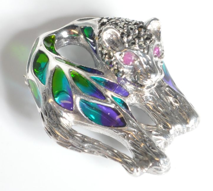 A stamped 925 silver plique a jour brooch in the form of a reclining cat having engraved features and pink glass eyes alongside marcasite's set to the back. Stamped to the underside. Measures 35mm long. Total weight 8.75g.