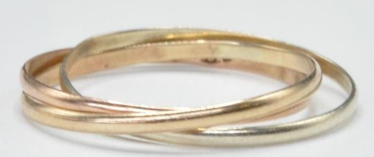 A 9ct gold tri-colour puzzle ring. The puzzle band ring with yellow, white and rose gold. Hallmarked for London 1991. Total weight 1.0g / Size N.5