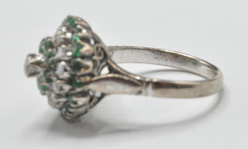 A white gold diamond and emerald cluster ring having a central round cut diamond (estimated 10 pts) surrounded by three halo's of round cut emerald and diamonds. Weight 5.6g. Size O.5. Gold unmarked but tests indicate 9ct gold. Size P.