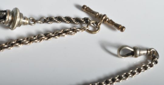 2 believed Victorian silver Albertina chains. Each of decorative form with ball spacers to one having tassled ends and lobster clasp. Together with  a pierced ball spacer centre, tassled ends and t-bar with lobster claw clasp. Total weight 20.1g / Length 24cm and 30cm approx