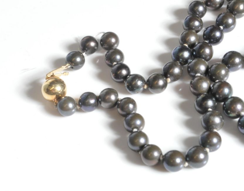 A cultured fresh water pearl necklace strung with round black pearls having a 14ct gold ball clasp. Clasp marked 585, two pearls unknotted near the clasp. Measures 18 inches.