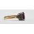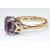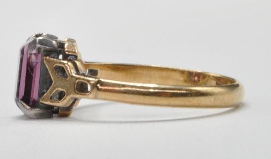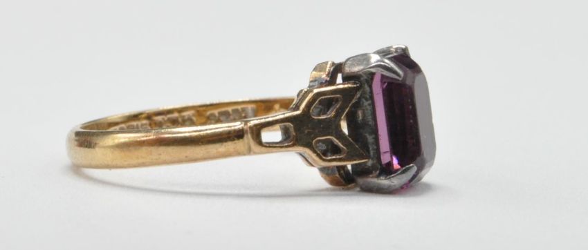 A 9ct gold and amethyst ring. The central cushion cut amethyst on silver setting to 9ct gold band ring. Stamped 9ct on silv setting. Total weight 2.3g / Size M.5