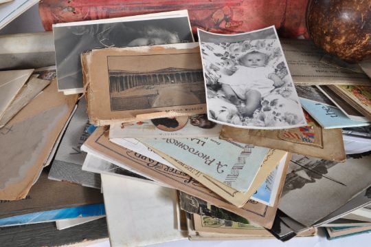 ASSORTED COLLECTABLES Box of various vintage items: black & white photos in album, Kitchenalia Inc. old cork screw & wooden tray with turned handles, ephemera & album of postcards,