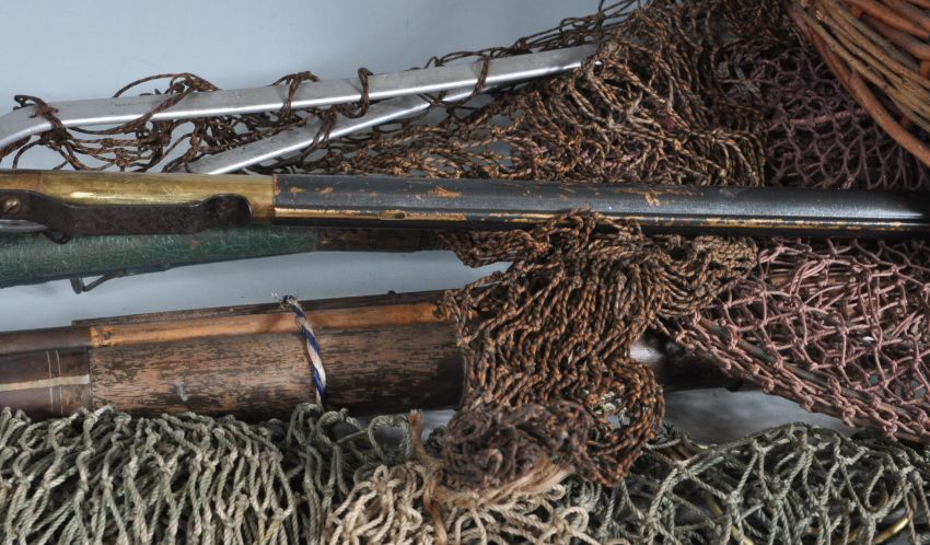 A collection of vintage 20th century fishing equipment to include: two vintage fishing rods, two fishing nets, Hardy rod bag, wicker fishing basket with accessories, etc.